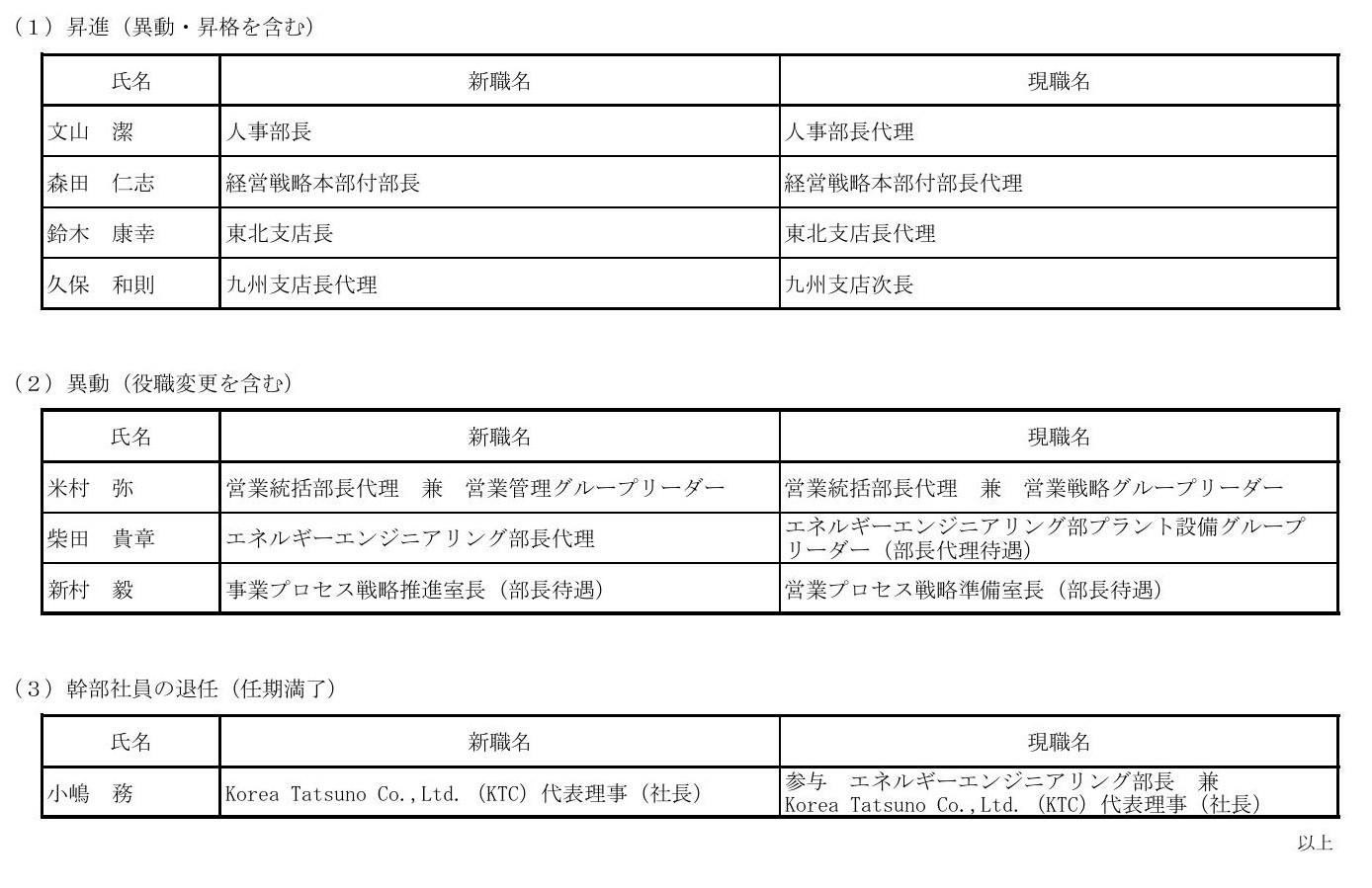 株式会社タツノは、2026年4月1日付の人事異動を決定しましたので、下記の通りお知らせいたします。